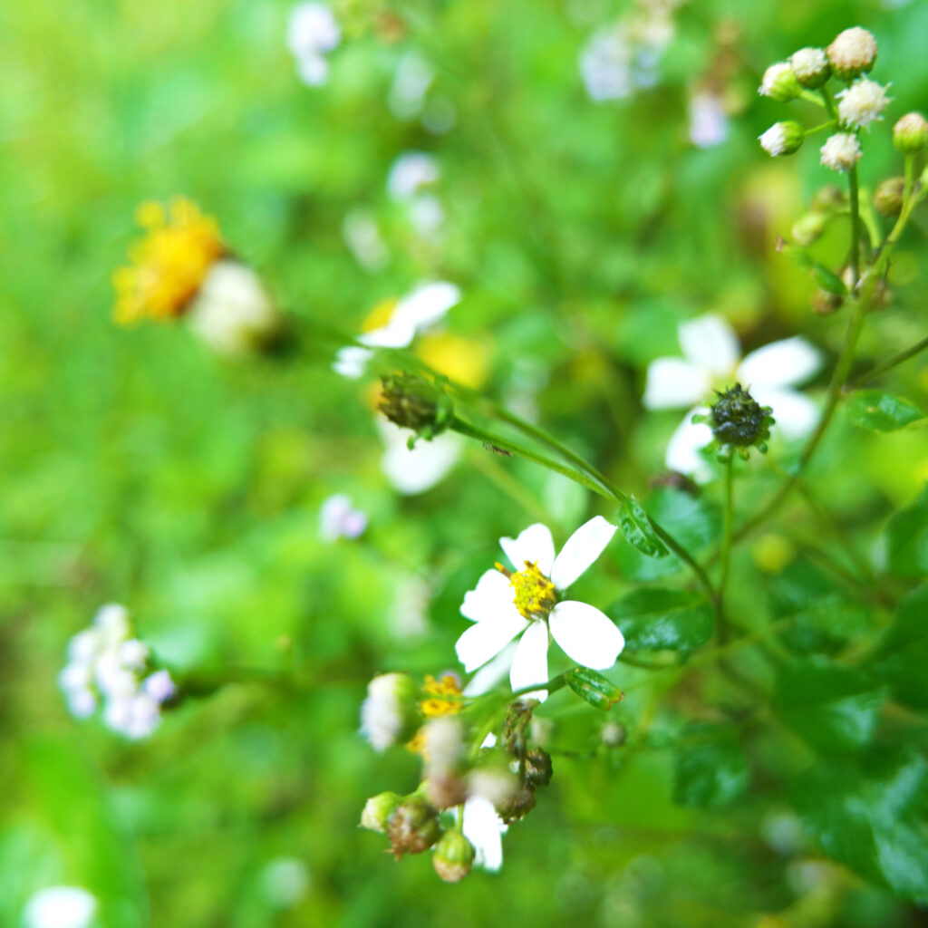 ビデンス・ピローサ(学名:Bidens pilosa)は、キク科の一年草で、和名はタチアワユキセンダングサ。熱帯・亜熱帯地域に広く分布する植物で、道端や畑に生える雑草として知られています。白や黄色の小さな花を咲かせ、種子に刺のような突起があり、服や動物の毛にくっつきやすいのが特徴です。